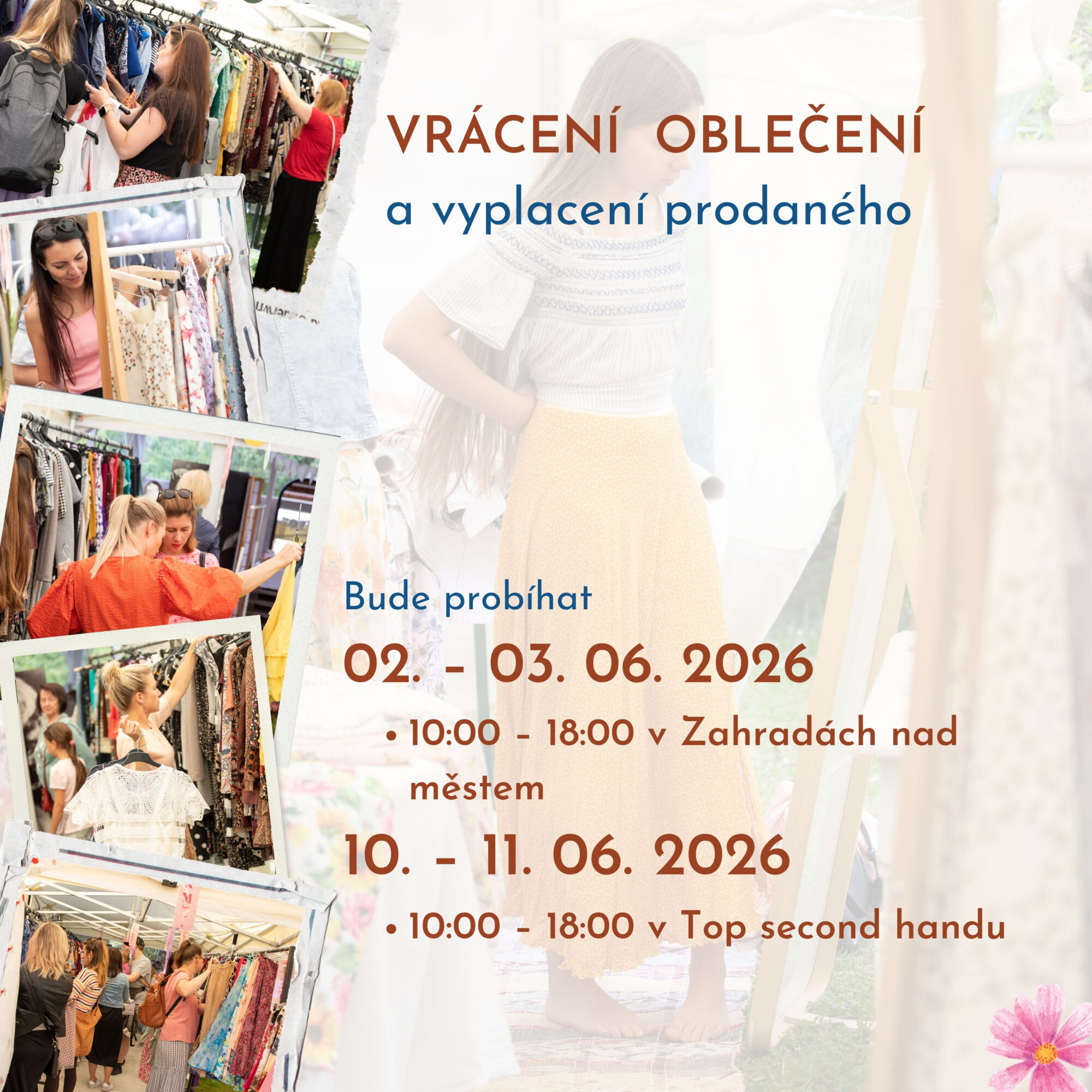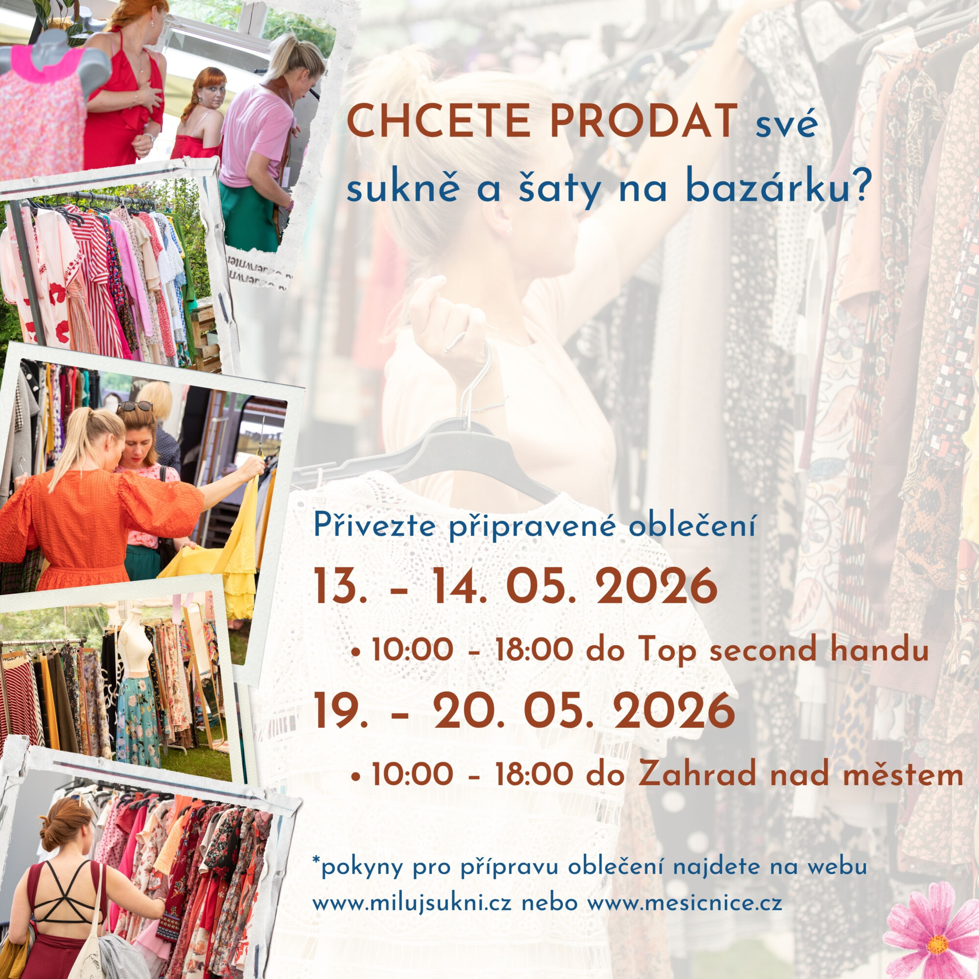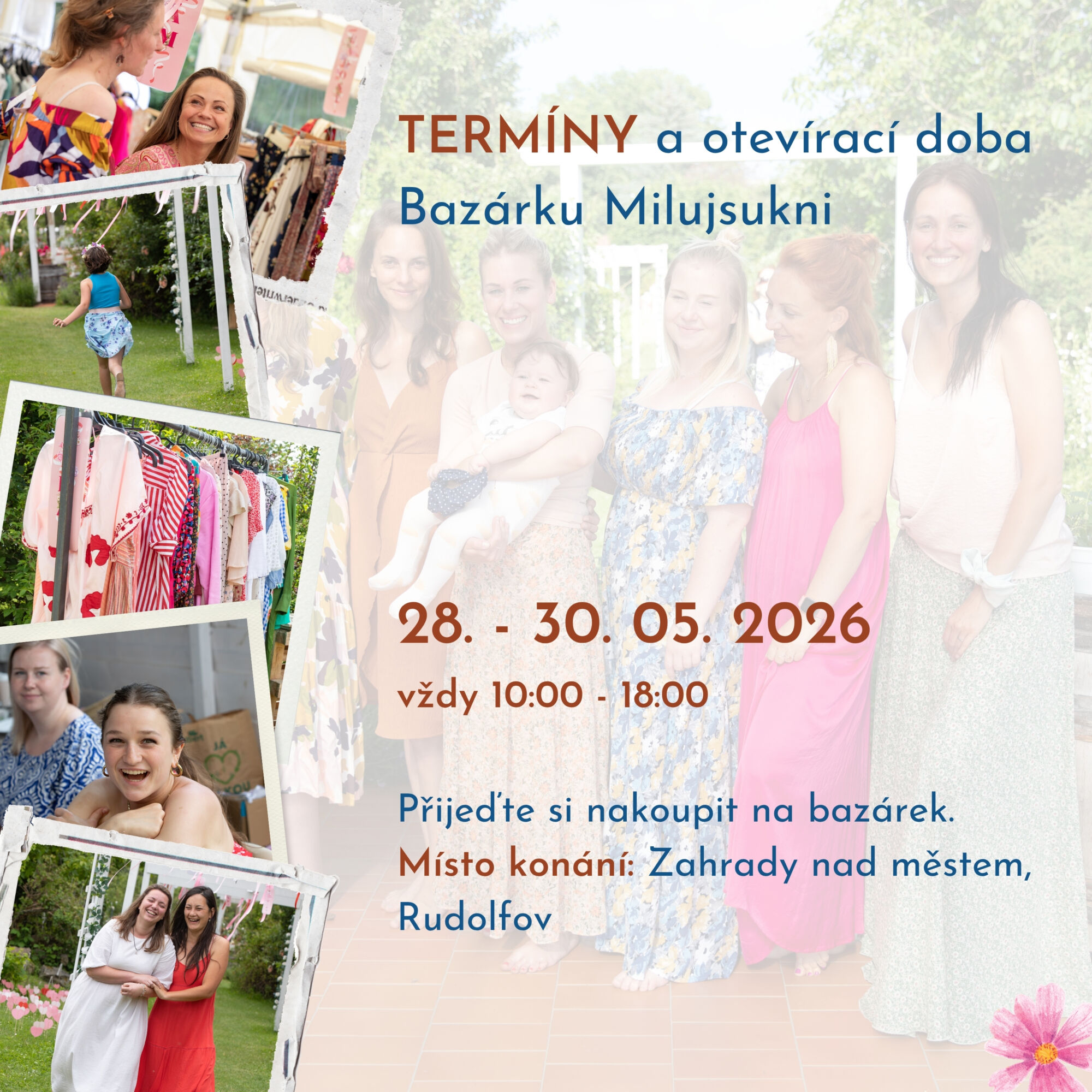 Po roční pauze se opět těšíme na tři dny plné radosti, proměn a barevných inspirací. Těšíme se na stálé tváře, které si náš bazárek pravidelně zapisují do diářů, i na nové ženy, které si vyzkouší naše sukně i šaty a pocítí, jak se v každém střihu a barvě odráží jejich vlastní radost a osobnost. S každým úsměvem a každým barevným detailem cítíme, že Bazárek Milujsukni je víc než jen nakupování – je to oslava ženskosti, něhy a společného času, který spolu můžeme prožít.