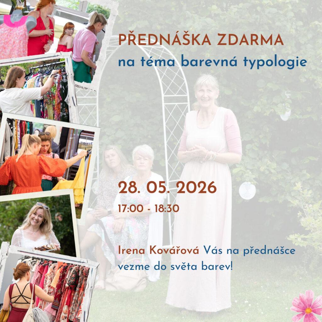 Pro naše stálice, i když letos piknik vynecháme, Irenka Kovářová vás vezme do světa barev v přednášce o barevné typologii. Ta bude 28.5. od 17:00. A teď pozor! Přednáška bude zcela zdarma a s dávkou inspirace, která rozzáří váš den.