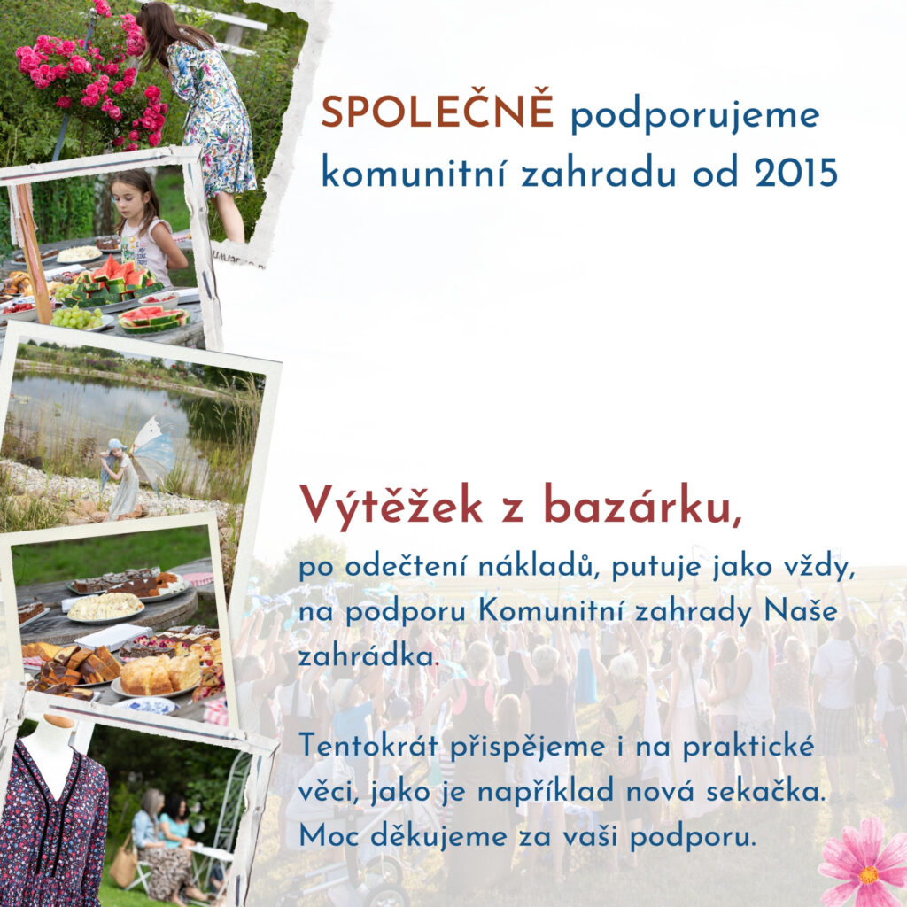 Opět podpoříme Komunitní zahradu Naše zahrádka: z provize 35% se uhradí nutné náklady a celý zisk poputuje na podporu projektu, viz odkaz: Komunitní přírodní zahrady Naše zahrádka.Pokud se vám projekt líbí, můžete jej podpořit tím, že oblečení do prodeje dáte s vyšší provizí pro organizátory nebo případně i zdarma. Toto stačí uvést na List prodávajícího. A celým srdcem za toto děkujeme.